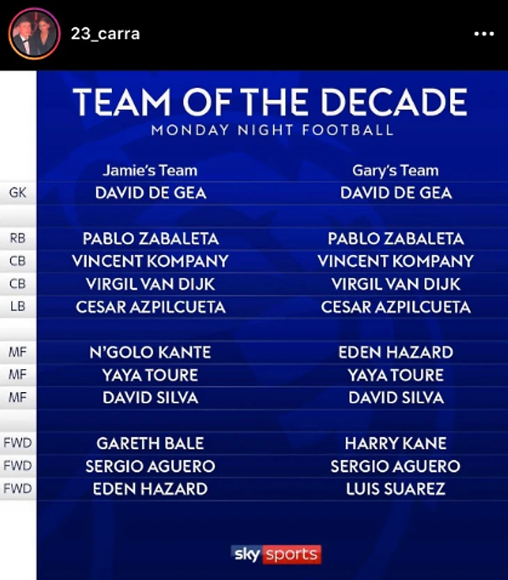 Девять футболистов попали как в сборную Невилла, так и Каррагера: вратарь Давид Де Хеа («Манчестер Юнайтед»), защитники Пабло Сабалета («Вест Хэм», экс-игрок «Манчестер Сити»), Венсан Компани (экс-игрок «Манчестер Сити»), Вирджил ван Дейк («Ливерпуль»), Сесар Аспиликуэта («Челси»), полузащитники Яя Туре (экс-игрок «Манчестер Сити»), Давид Сильва («Манчестер Сити») и форвард Серхио Агуэро («Манчестер Сити»).