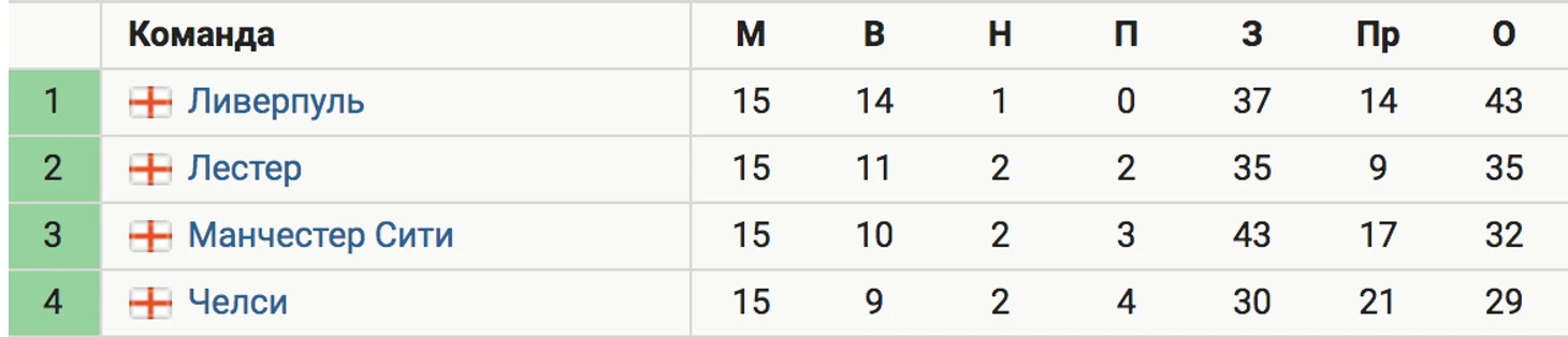 Команда Юргена Клоппа, набрав 43 очка, продолжает лидировать в турнирной таблице, опережая идущий вторым «Лестер» на 8 очков, а «Манчестер Сити», который занимает третью позицию, – на 11.