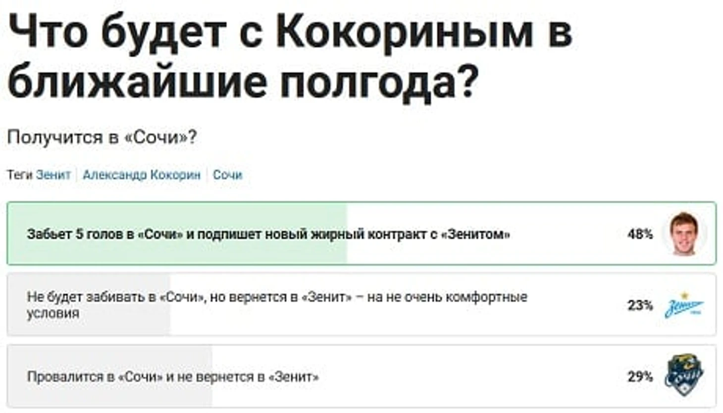 Большинство голосов, 48%, отдано за вариант «Забьет 5 голов в «Сочи» и подпишет новый жирный контракт с «Зенитом».