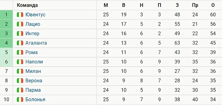 После 25 туров Серии А команда Стефано Пиоли занимает 7-е место в турнирной таблице, имея на своем счету 36 очков и отставая от зоны Лиги чемпионов на 9 баллов.