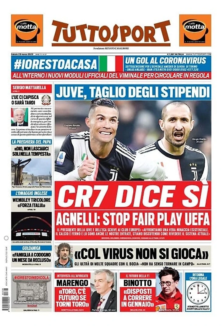 Роналду согласен на снижение зарплаты. Кьеллини предложил игрокам «Юве» пойти на уступки