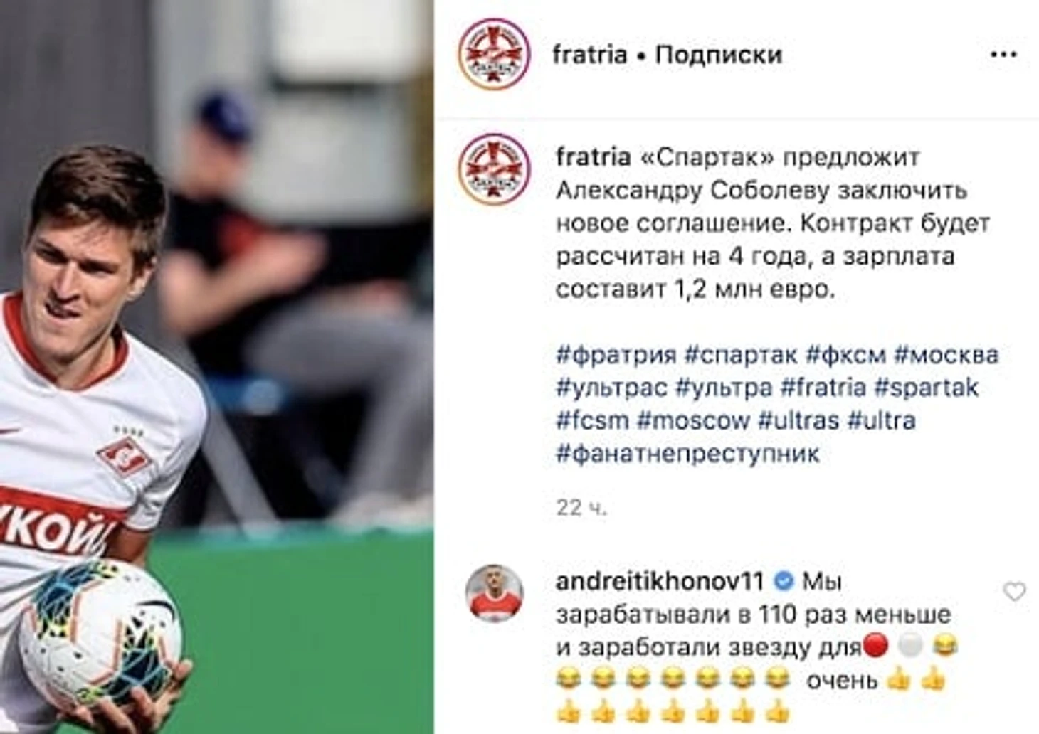 «Мы зарабатывали в 110 раз меньше и заработали звезду для «Спартака», – написал Тихонов на странице объединения болельщиков клуба «Фратрия» в инстаграме, добавив смеющиеся смайлики.