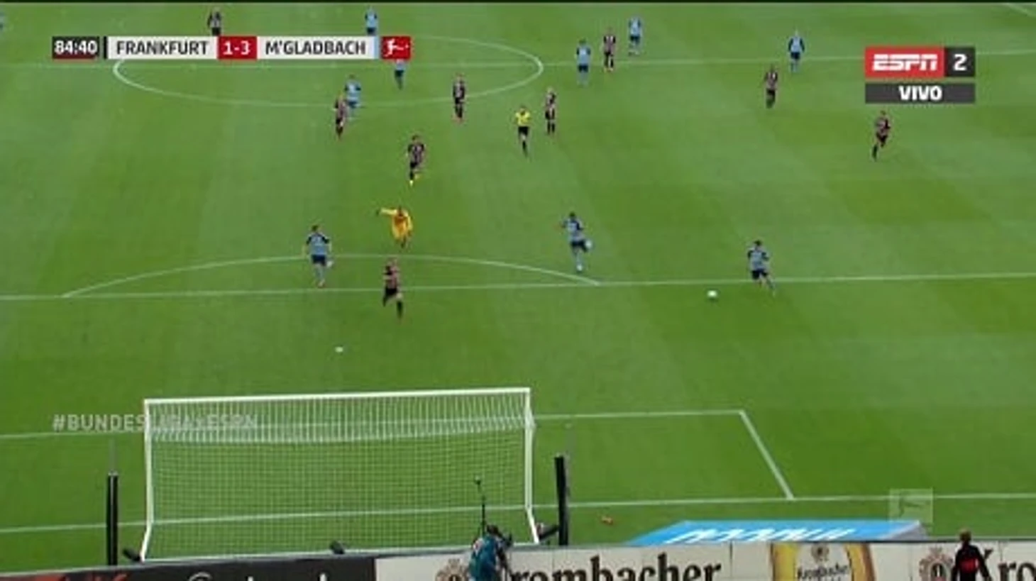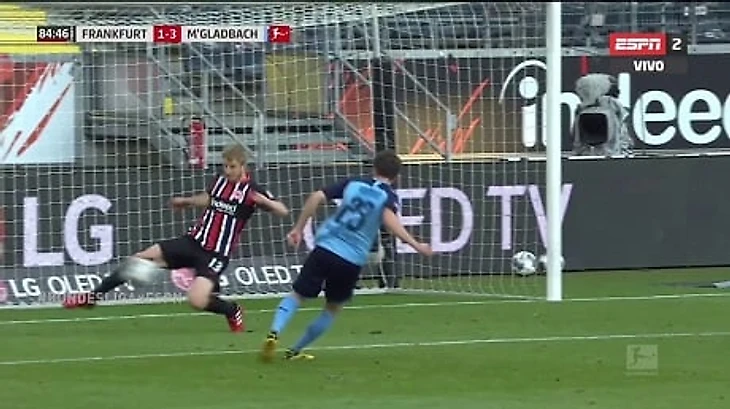 Однако защитник «Айнтрахта» Мартин Хинтереггер успел занять место в воротах и среагировать на удар, отразив мяч ногой.