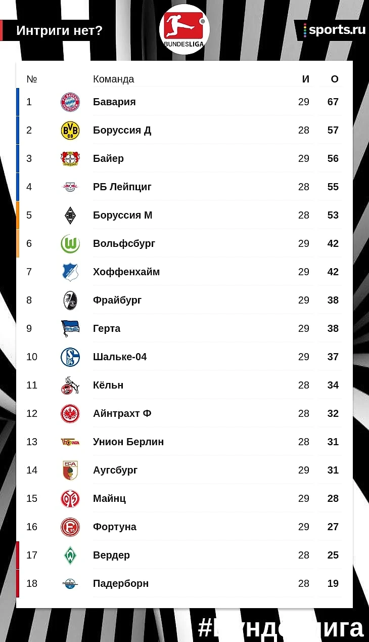 «Бавария» оторвалась на 10 очков от второго места в Бундеслиге. У «Дортмунда» есть матч в запасе