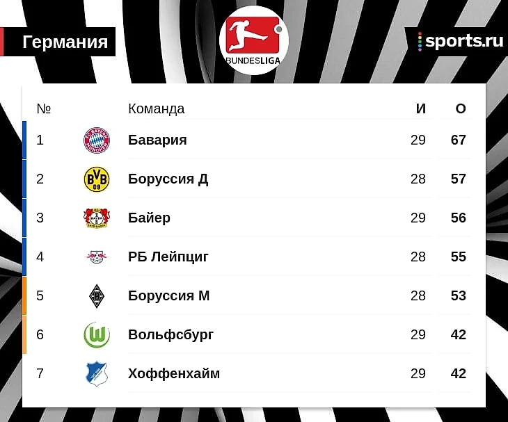 После 29 туров команда Ханса-Дитера Флика занимает первую строку в таблице чемпионата Германии, набрав 67 очков.