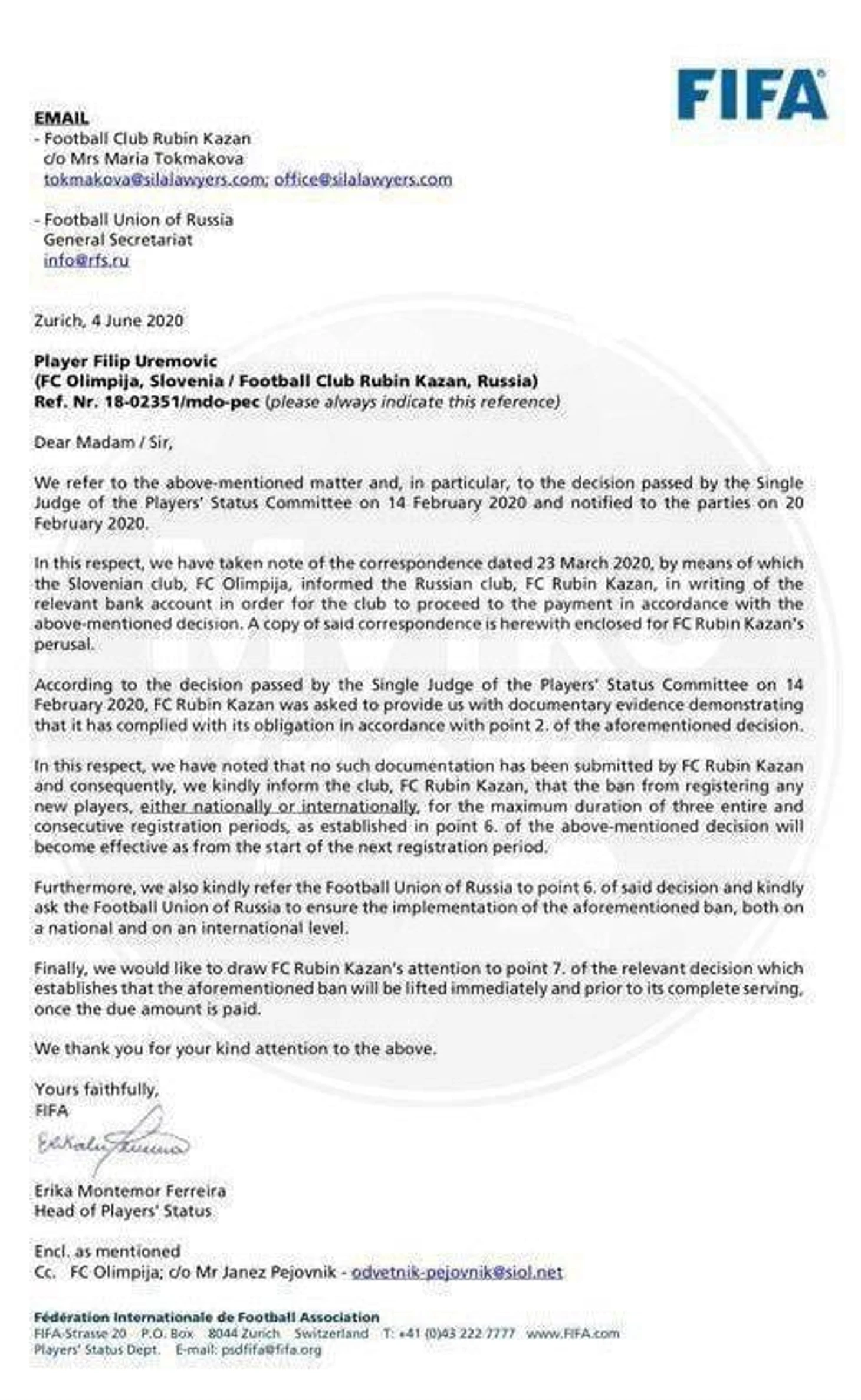 Ранее словенская «Олимпия» обратилась с жалобой в организацию на то, что казанский клуб отказывается платить неустойку за несвоевременную оплату трансфера защитника Филипа Уремовича.