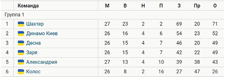 На счету «Шахтера» 71 очко, он опережает «Динамо» на 19 баллов. Киевляне имеют матч в запасе, однако уже потеряли математические шансы выйти на первое место.