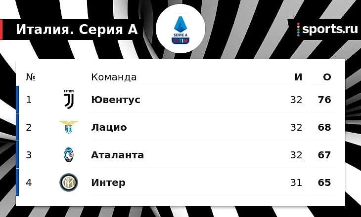 Туринцы продолжают лидировать в чемпионате Италии, набрав 76 очков. «Аталанта» упустила шанс выйти на второе место и идет третьей (67 очков).