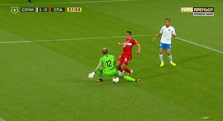 На 38-й минуте главный судья встречи Сергей Иванов не стал назначать пенальти после инцидента, в котором форвард москвичей Эсекиэль Понсе упал в штрафной «Сочи» после контакта с голкипером хозяев Николаем Заболотным.