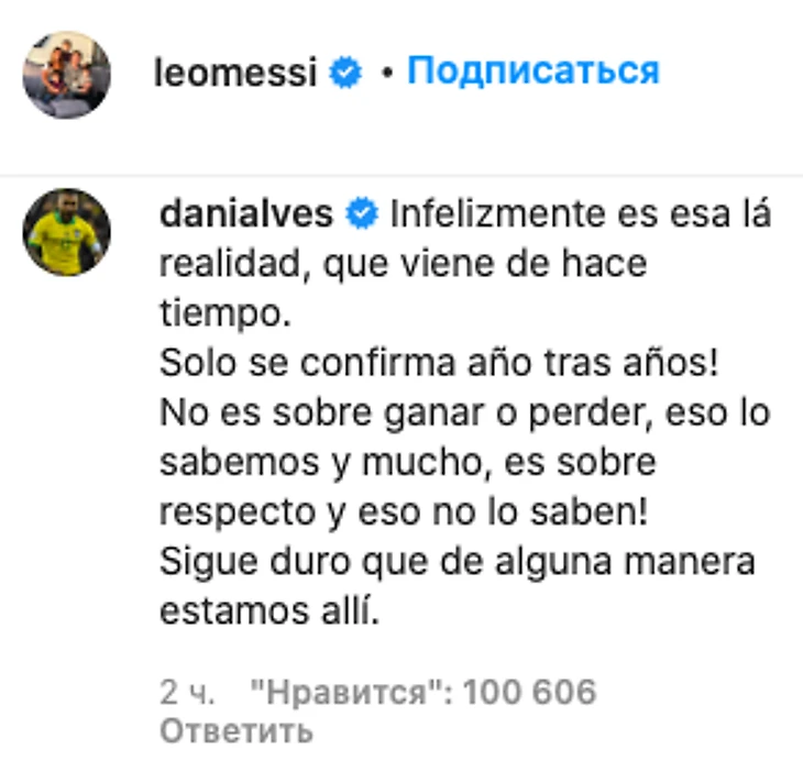 «К сожалению, это реальность уже долгое время. Это подтверждается год за годом. Дело не в победе или поражении. Дело в уважении, а они этого не знают», – написал Алвес, имея в виду, скорее всего, руководство «Барселоны».