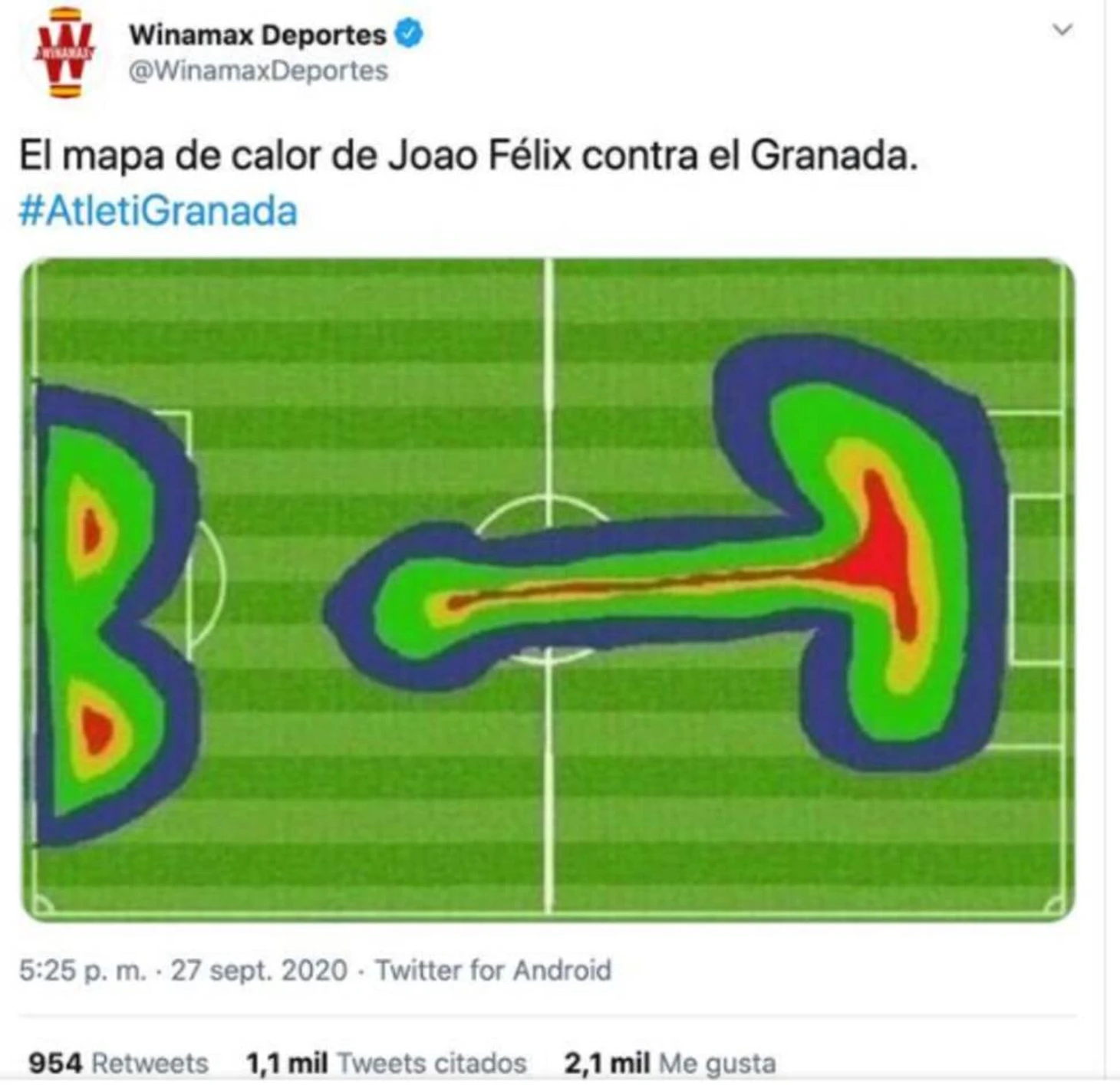 Букмекерская компания Winamax Deportes, которая является спонсором «Гранады», опубликовала в твиттере тепловую карту действий атакующего полузащитника мадридцев Жоау Феликса, изобразив ее в виде пениса.