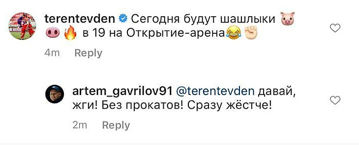 «Сегодня будут шашлыки 🐷🐽🔥. В 19:00 на «Открытие Арене» 😂✊🏻», – написал Терентьев в комментариях на странице в инстаграме PR-менеджера Артема Гаврилова.