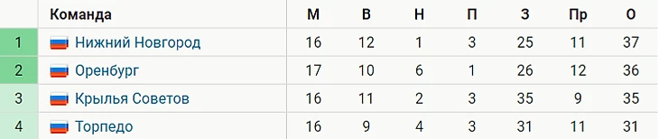 После 17 матчей «Оренбург» в настоящий момент располагается на 2-й строчке таблицы ФНЛ, отставая от «Нижнего Новгорода» на 1 балл, проведя при этом на игру больше.