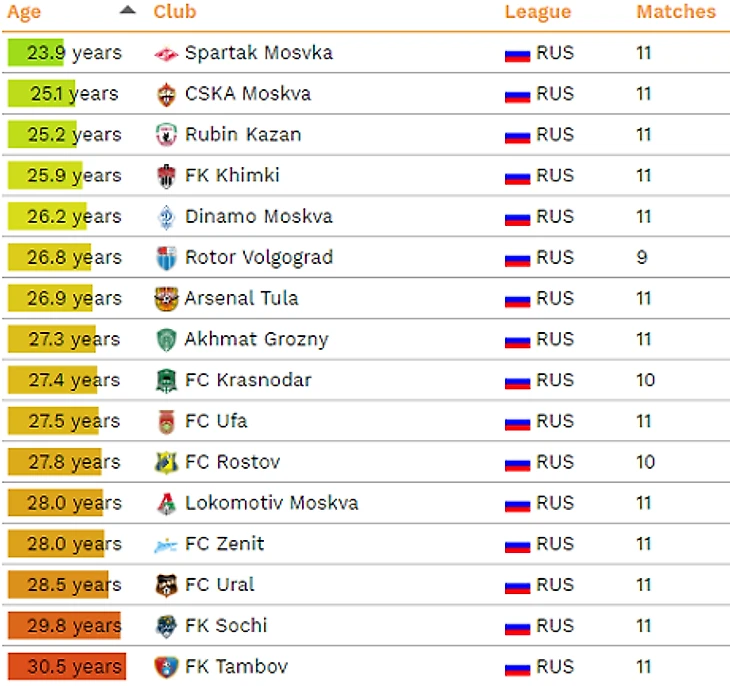По среднему возрасту игроков, выходивших на поле, «Спартак» значительно моложе остальных команд РПЛ. На втором месте идет ЦСКА – 25,1 лет, на третьем – «Рубин» – 25,2 лет.