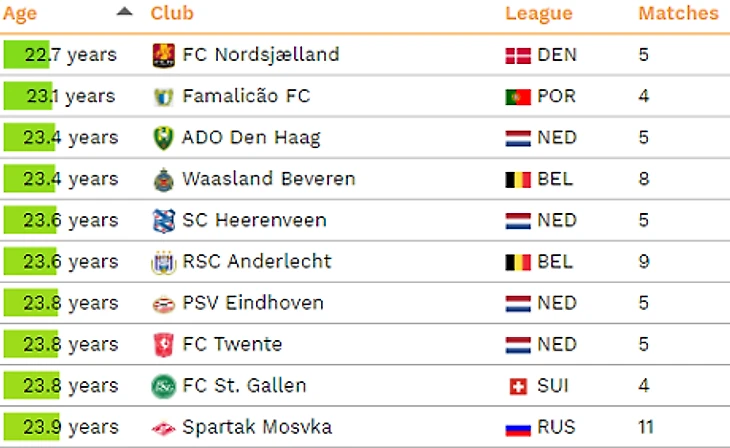 «Спартак» со средним возрастом состава на поле в 23,9 года вошел в топ-10 самых молодых команд 20 ведущих европейских лиг. Самый молодой состав в топ-20 лиг у датского «Нордшелланда» – 22,7 года, на втором месте – португальский «Фамаликан» – 23,1 года.