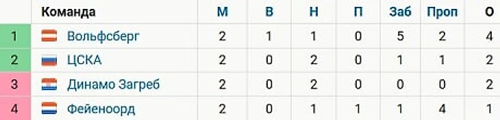 «Вольфсберг», разгромивший «Фейеноорд» (4:1), лидирует в группе (4 балла). «Динамо» уступает ЦСКА по дополнительным показателям, имея те же 2 очка, а «Фейеноорд» с одним баллом идет четвертым.