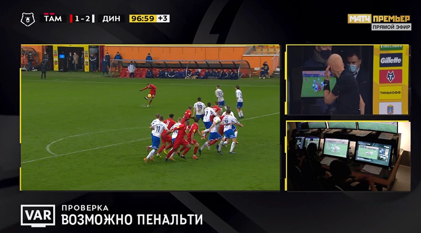 В добавленное ко второму тайму время форвард москвичей Николай Комличенко сфолил на защитнике тамбовчан Адесойе Ойеволе в своей штрафной, потянув его за руку.