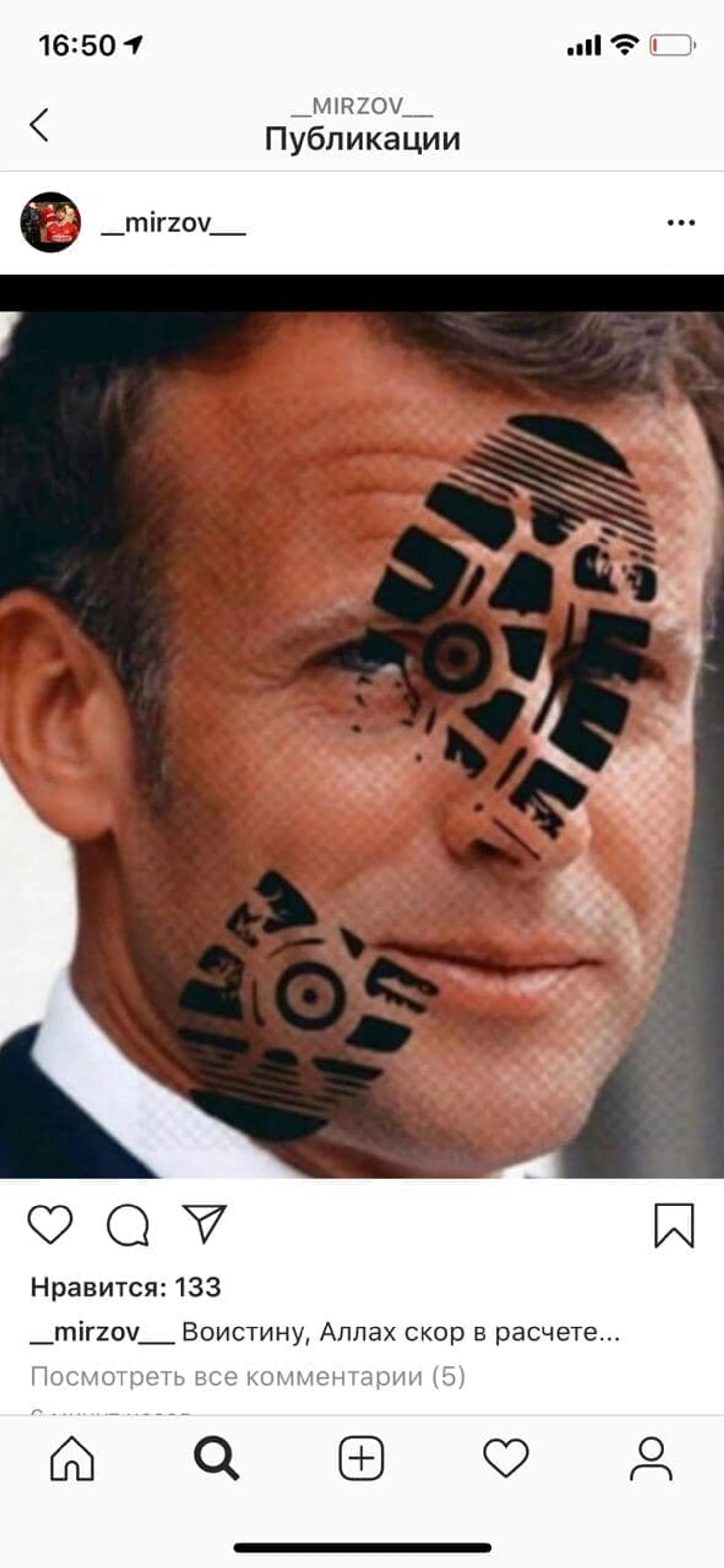 Мирзов выложил фото французского политика с отпечатком обуви на лице, подписав его: «Воистину, Аллах скор в расчете».