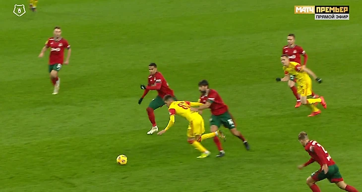 Сперва Чорлука неаккуратно сыграл против Луки Джорджевича, а затем Даниил Хлусевич развернулся и ушел от соперника, готовясь войти в штрафную, и защитнику «Локо» пришлось фолить.