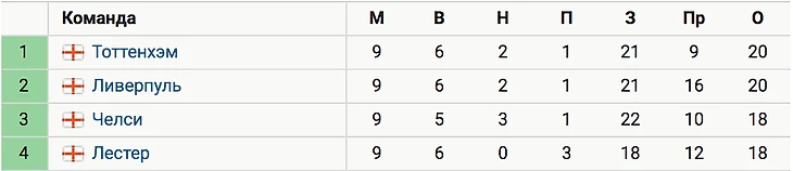 Лидирует «Тоттенхэм», который также набрал 20 очков, но опережает «красных» благодаря лучшей разнице забитых и пропущенных мячей.