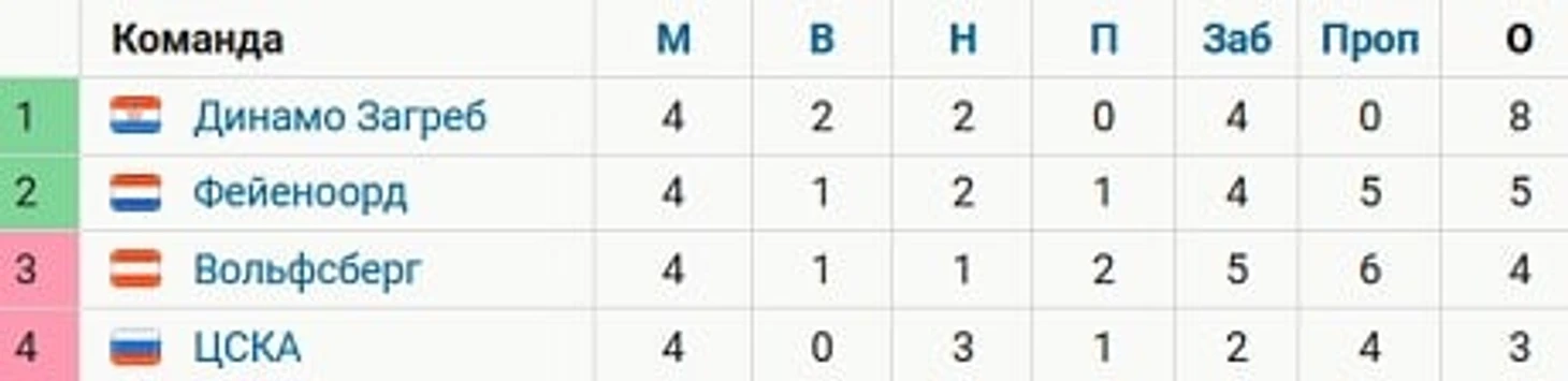 Возглавляет группу загребское «Динамо» (8 баллов), «Фейеноорд» – второй (5), «Вольфсберг» – третий (4).