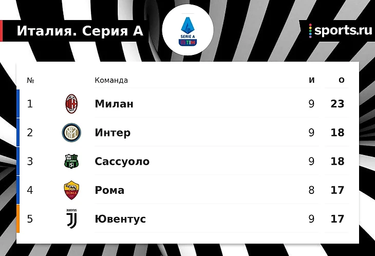 «Милан» лидирует в турнирной таблице Серии А с 5-очковым отрывом от «Интера» и «Сассуоло». У «Ювентуса» и «Ромы» на 6 очков меньше, но у римлян есть игра в запасе.