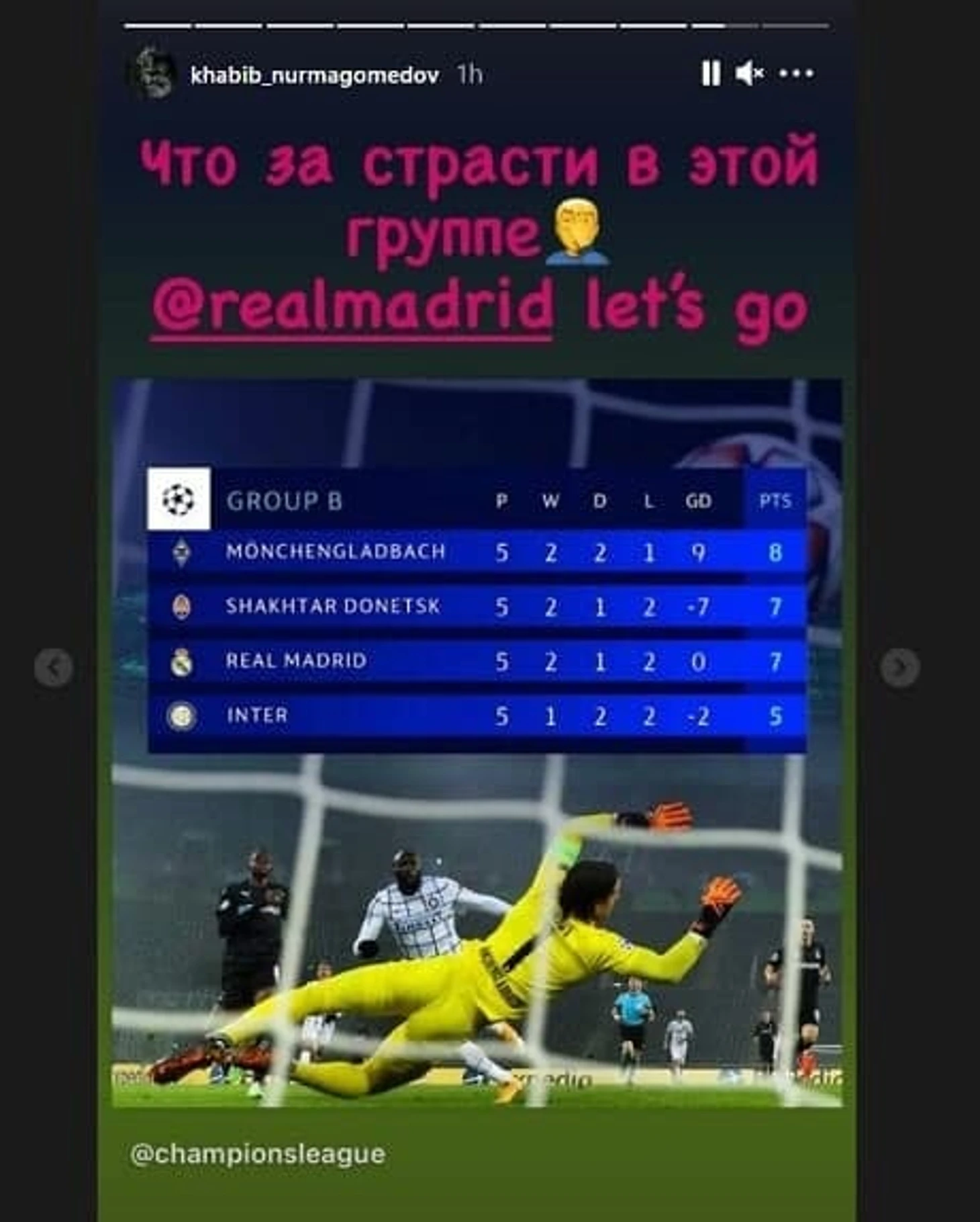 «Что за страсти в этой группе. Вперед, «Реал», – написал Хабиб в сторис инстаграма, приложив скриншот таблицы группы B.