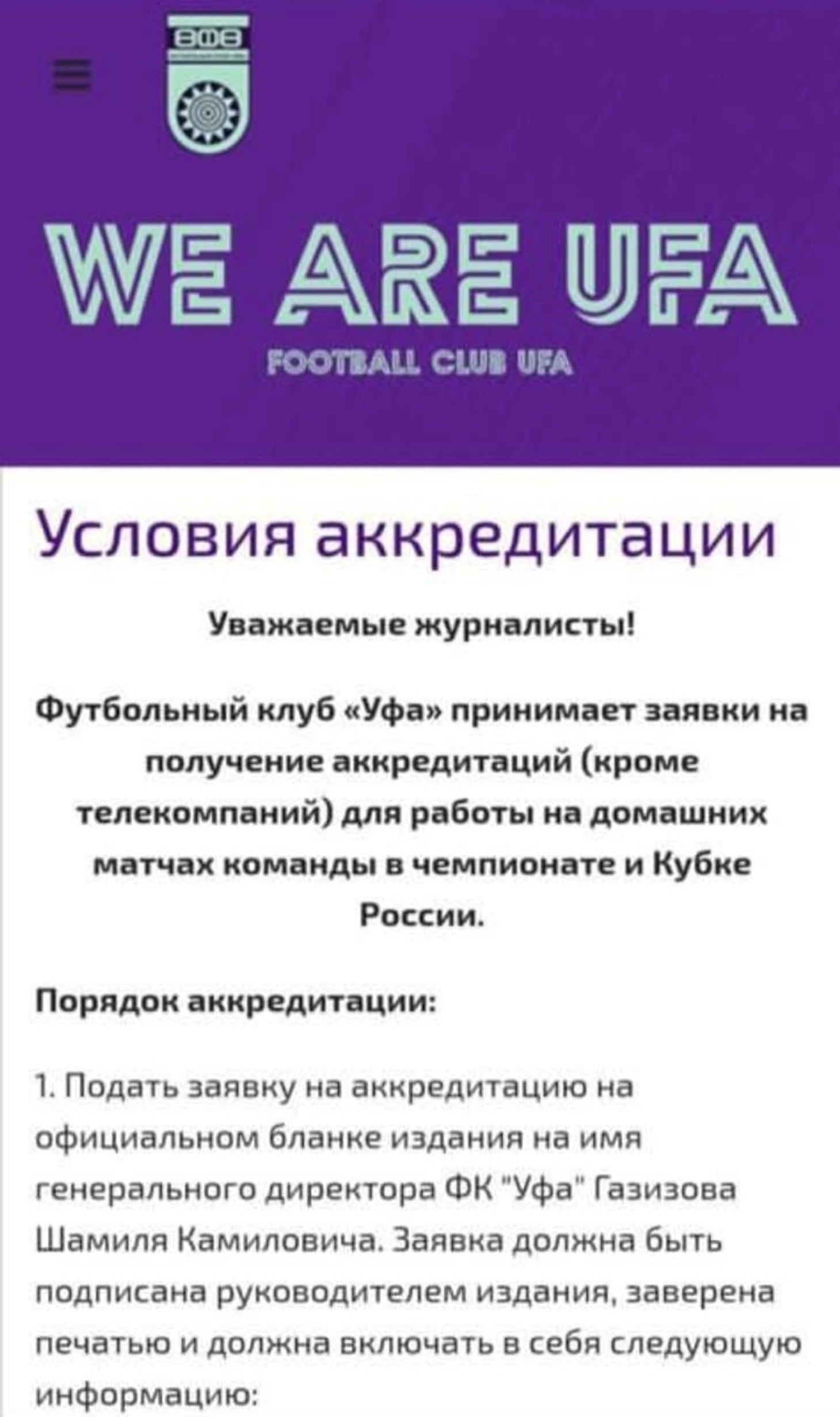В разделе сайта, в котором рассказывается об условиях аккредитации журналистов на матчи «Уфы», сказано: «[Необходимо] Подать заявку на аккредитацию на официальном бланке издания на имя генерального директора ФК «Уфа» Газизова Шамиля Камиловича».