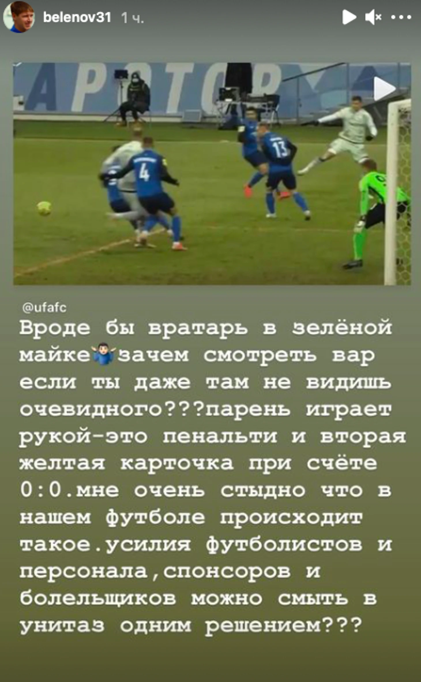 Мне очень стыдно, что в нашем футболе происходит такое. Усилия футболистов и персонала, спонсоров и болельщиков можно смыть в унитаз одним решением?» – написал Беленов в сторис инстаграма.