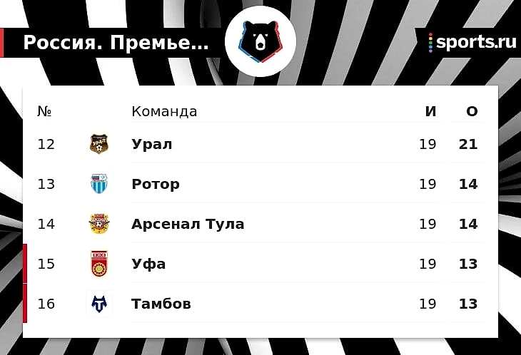 На 15-м месте идет «Уфа», у которой столько же очков, сколько у «Тамбова», но преимущество по результатам личных встреч (0:2, 4:0).