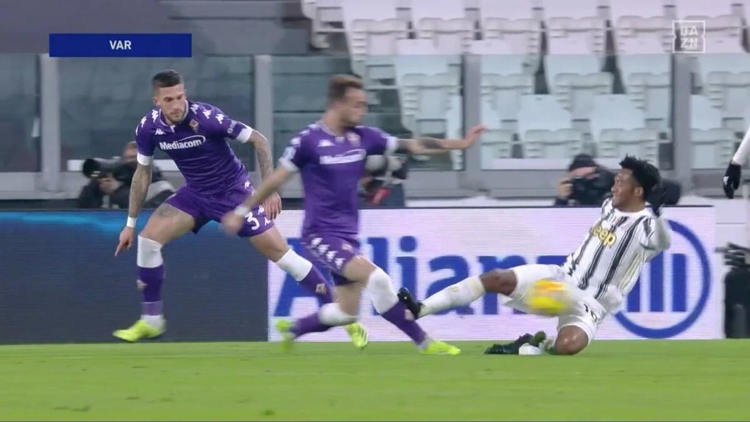 На 18-й минуте главный арбитр Федерико Ла Пенна показал красную карточку полузащитнику туринцев Хуану Куадрадо, воспользовавшись помощью видеоассистента. Колумбиец пошел в подкат у штрафной «фиалок» и прямой ногой угодил в голень хавбеку Гаэтано Кастровилли.