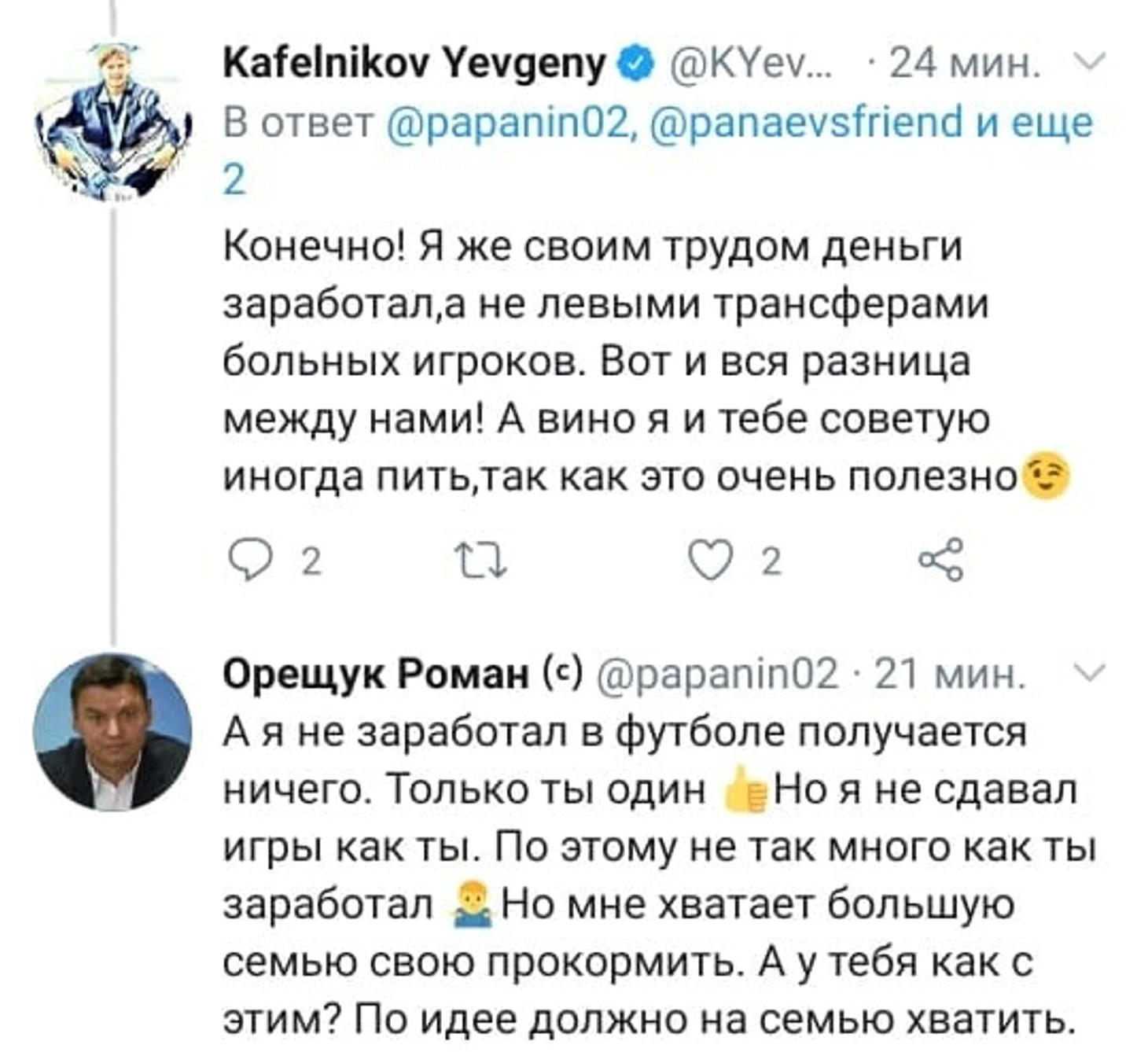«Я своим трудом заработал, а не левыми трансферами больных игроков. Вот и вся разница между нами!» – написал Кафельников.