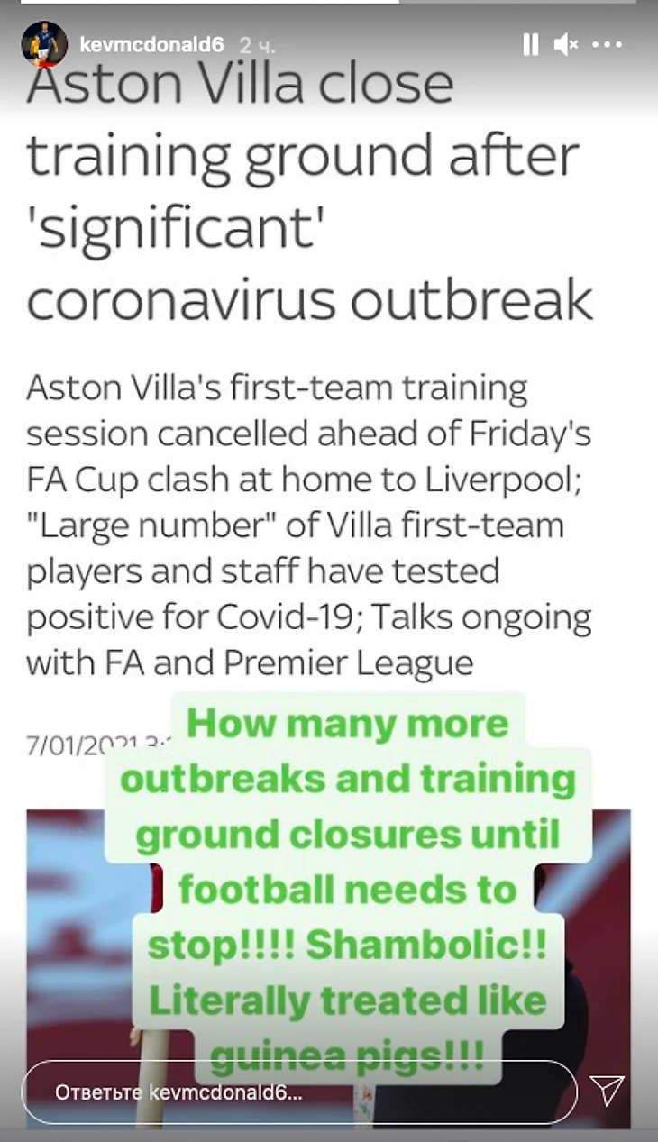 Они буквально обращаются с нами как с морскими свинками!» – написал Макдоналд в сторис своего инстаграма, приложив скриншот новости о вспышке COVID-19 в «Астон Вилле».