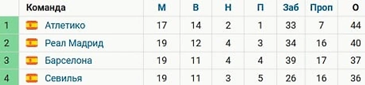 «Барселона» сейчас занимает третье место в таблице, набрав 37 очков. У «Реала» на 3 балла больше. У «Атлетико» 44 очка и 2 игры в запасе по сравнению с главными конкурентами.