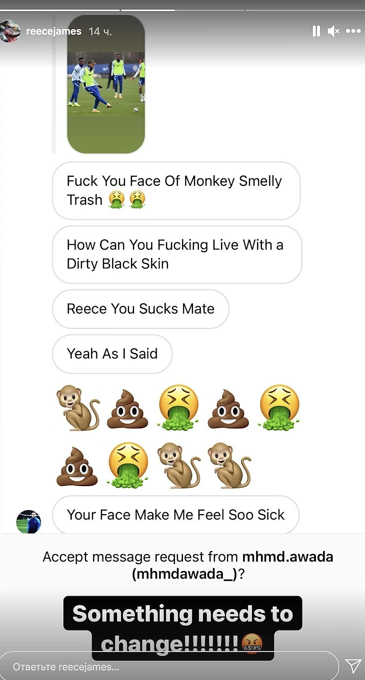 Защитник «Челси» Рис Джеймс подвергся расистским оскорблениям в инстаграме.