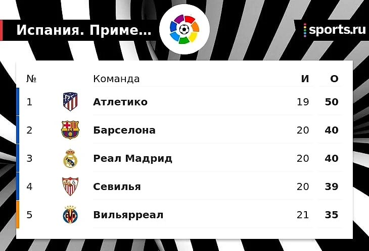 Таким образом, после 21-го тура чемпионата Испании «Атлетико» опережает «Барсу» и «Реал» на 10 очков, имея матч в запасе.