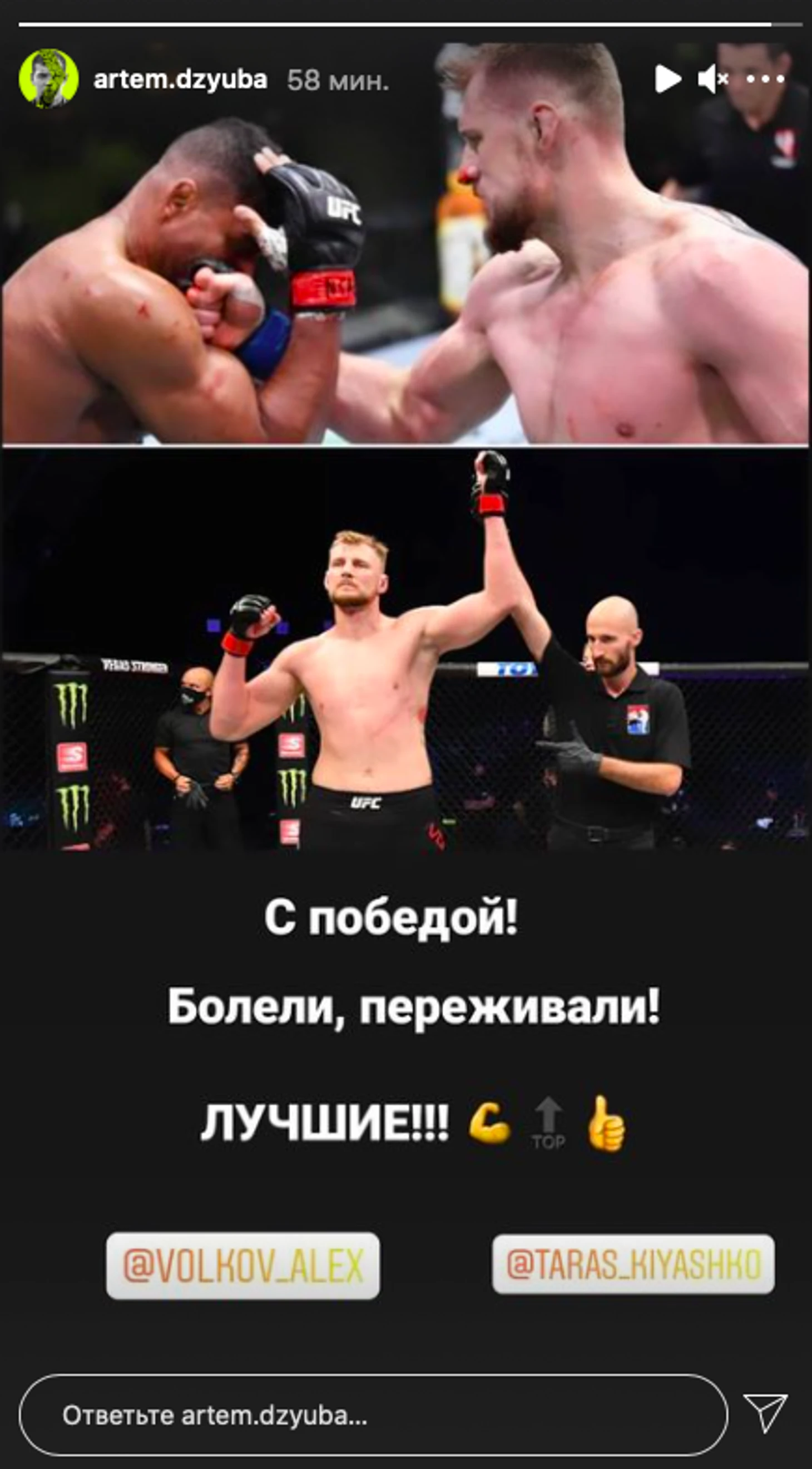 «С победой! Болели, переживали! Лучшие!» – написал Дзюба в инстаграме, отметив Александра Волкова и его тренера Тараса Кияшко.