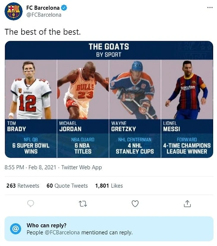 На ней изображены 43-летний квотербек Том Брэди, экс-баскетболист Майкл Джордан, бывший хоккеист Уэйн Гретцки и нападающий «Барсы» Лионель Месси с подписью GOAT («Лучшие игроки всех времен» – прим. Sports.ru).