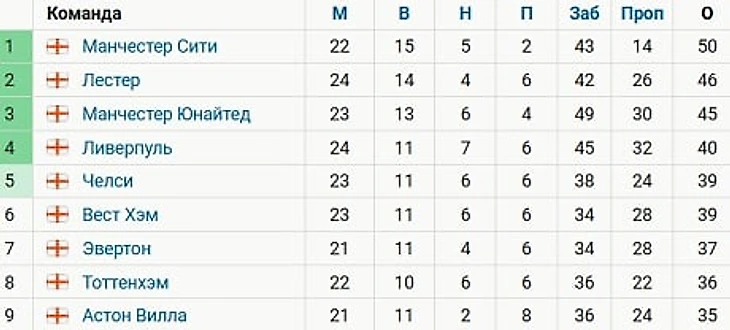 У «Челси» и «Вест Хэма» по 39 очков и по матчу в запасе. «Эвертон» провел 21 матч и набрал 37 очков, «Тоттенхэм» – 36 после 22 игр, «Астон Вилла» – 35 после 21 матча.