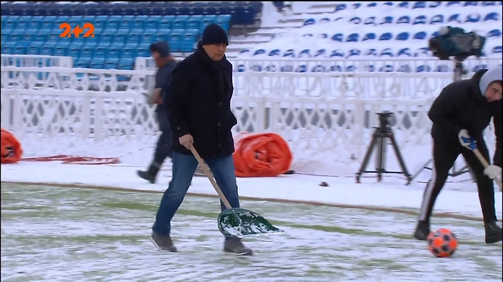 Главный тренер киевской команды Мирча Луческу лопатой чистил от снега поле стадиона имени Лобановского.