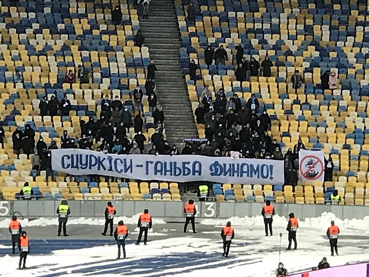 На баннерах написано «Lucescu, go away» («Луческу, уходи») и «Сцуркіси – ганьба «Динамо» («Сцуркисы – позор «Динамо»).