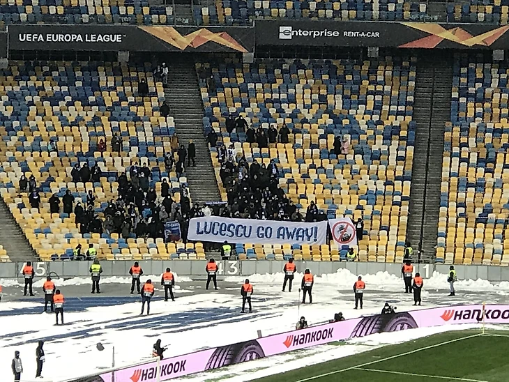 Активные болельщики «Динамо» во время первого матча 1/16 финала Лиги Европы с «Брюгге» вывесили баннеры против главного тренера киевской команды Мирчи Луческу и владельцев клуба братьев Суркисов.