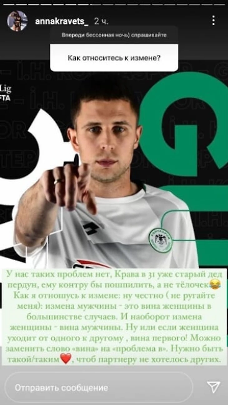 Анна Кравец, жена нападающего «Коньяспора» Артема Кравца, ответила на вопрос о том, как относится к изменам.