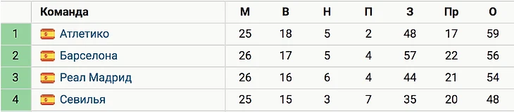 «Барселона» занимает второе место (56 очков, 26 матчей), «Реал» идет третьим (54 очка, 26 матчей).