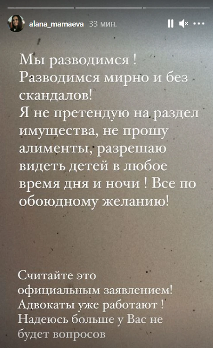 Считайте это официальным заявлением! Адвокаты уже работают. Надеюсь, больше у вас не будет вопросов», – написала Мамаева в инстаграме.