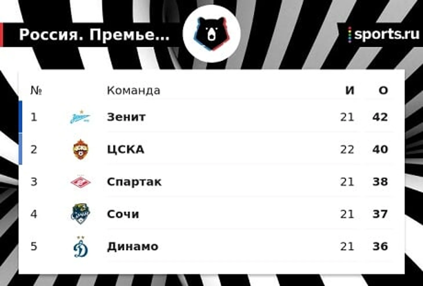 Лидирует в таблице «Зенит», у которого на данный момент 42 очка в 21 матче.