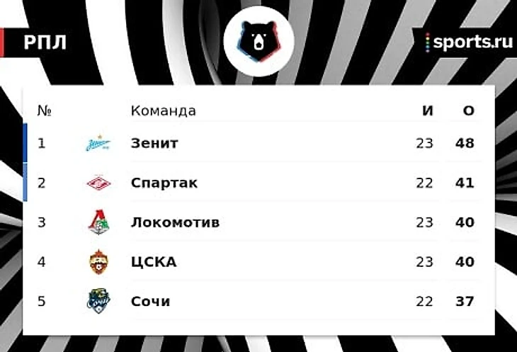 После 23 матчей у «Зенита» 48 очков, «Спартак» с 44 очками отстает на 4 балла. У «Локомотива» и ЦСКА по 40 очков, они отстают от лидера на 8 баллов.