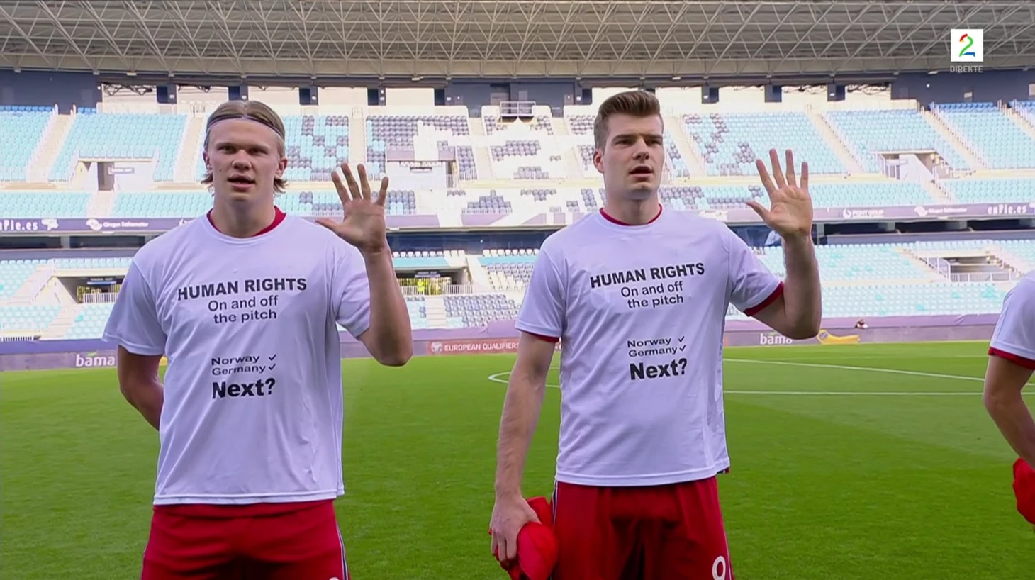Футболисты норвежской команды надели футболки с надписью «Права человека – на поле и вне его». Такая же надпись была на футболках перед последним матчем с Гибралтаром (3:0).