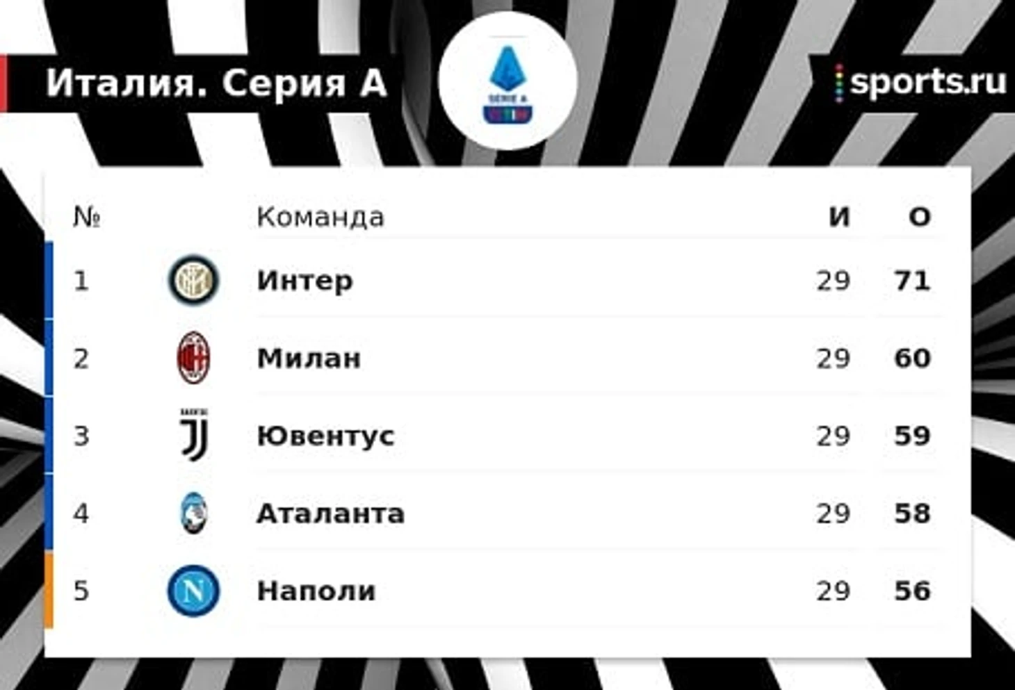 «Ювентус» отстает от лидера на 12 очков, расположившись на третьей строчке. На четвертом месте – «Аталанта» с 58 очками, «Наполи» – 5-й с 56 очками.
