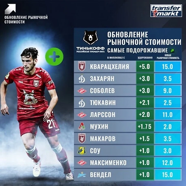 Больше всех среди игроков чемпионата России подорожал полузащитник «Рубина» Хвича Кварацхелия – его цена возросла на 5 млн евро и составляет 15 млн.